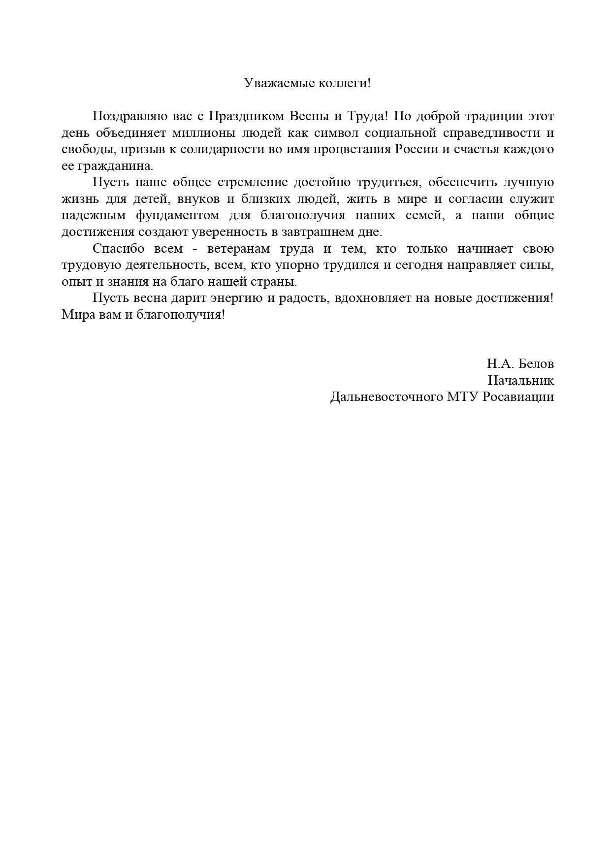 Поздравление начальника Дальневосточного МТУ Росавиации Белова Н.А. с Праздником Весны и Труда