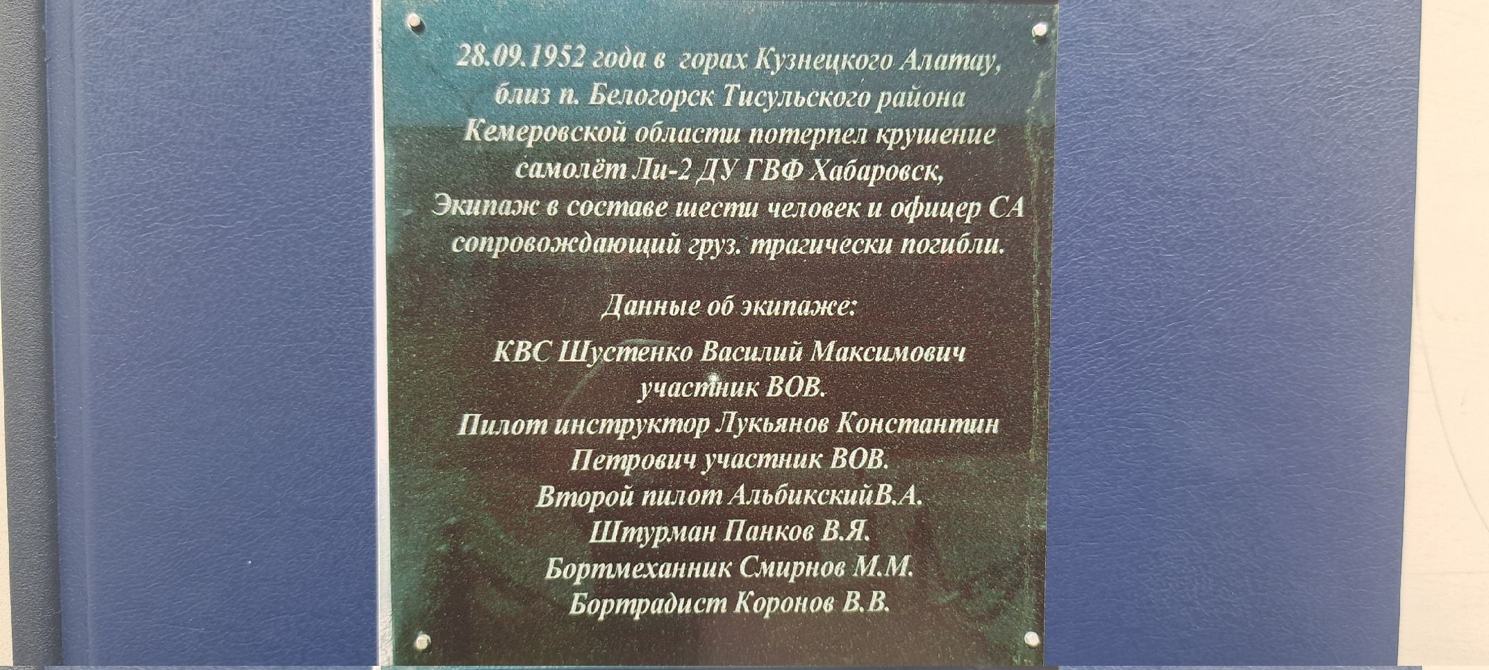 27.11.2025 «69 лет безмолвия... Может быть поэтому у меня хватило сил сделать это. Надеюсь, все что сделано, сделано не зря.» - Василевская Людмила Ивановна (Белогорск, Кемерово, сестра жены командира Шустенко В.М.). В распоряжение Дальневосточного МТУ Росавиации от Людмилы Ивановны получены уникальные материалы по увековечению памяти экипажу самолета Ли-2 Л4673 Дальневосточного управления гражданского воздушного флота, погибшему в авиакатастрофе 28 сентября 1952 года вблизи поселка Белогорск Кемеровской области. Экипаж выполнял рейс по маршруту Хабаровск - Ташкент, состав экипажа и пассажир: Шустенко Василий Максимович - командир ВС Лукьянов Константин Петрович - пилот-инструктор Альбицкий Валерий Александрович - второй пилот - стажер Панков Валерий Яковлевич - штурман Коропов Владимир Васильевич - бортрадист Смирнов М.М. - бортмеханик (имя, отчество неизвестны) Рахимов Насырджан Закирович - младший техник лейтенант в/ч 34705 (сопровождающий груз). По результатам расследования наиболее вероятной причиной катастрофы самолета следует считать попадание самолета в исключительно сложные метео условия (сильное обледенение и сильная болтанка). Обломки самолета и останки людей не могли найти долгих 15 лет. И только зимой 1967 года житель Белогорска охотник вблизи поселка на склоне горы случайно обнаружил обломки самолета. Эта история ожила благодаря Людмиле Ивановне и Антропову Геннадию Петровичу жителю Белогорска, который дважды побывал на месте катастрофы и увиденная картина обломков самолета тронула его до глубины души. Он сделал фотографии Шустенко В.М. и Лукьянова К.П. (в архивах были только 2 фото) и с товарищем прикрепил их к уцелевшей части самолета. Рядом на борту прикрепил металлическую доску. Мемориальная доска на месте катастрофы была привезена комиссией Западно-Сибирского управления ГВФ 27 мая 1967 г. Антропов Г.П. вместе с Василевской Л.И. (нашли друг друга через социальную сеть) с глубоким интересом стали изучать сведения об экипаже, искали сведения в архивах, направляли запросы в различные организации, не теряя надежды на успех... 12 июня 2023 г. в Белогорске у Памятника Славы установлена мемориальная доска памяти погибшим, у которой ежегодно проходят торжественные митинги. Выражаем искреннюю благодарность Людмиле Ивановне и Геннадию Петровичу за неравнодушное отношение и многолетний труд по увековечению памяти экипажу Ли-2.