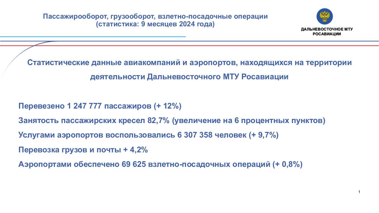 За 9 месяцев 2024 года авиакомпаниями, находящимися на территории деятельности Дальневосточного МТУ Росавиации, перевезено 1 247 777 пассажиров, что больше на 12% чем за аналогичный период 2023 года. На внутренних воздушных линиях перевезено 1 154 599 пассажиров, увеличение на 8,4%. Воздушный трафик на международных рейсах вырос на 93% и составил 93 178 человек. Пассажирооборот увеличился на 16%. Перевозки грузов и почты увеличились по сравнению с прошлым годом на 4,2%, грузооборот на 1,8%. Процент занятости пассажирских кресел вырос на 6 процентных пунктов и составил 82,7%. За 9 месяцев текущего года наблюдается активный рост всех ключевых производственных показателей в аэропортах. Услугами аэропортов, находящихся на территории деятельности Управления, воспользовались 6 307 358 человек, что больше чем за аналогичный период прошлого года на 9,7%. Аэропортами обеспечено 69 625 взлетно-посадочных операций, что на 0,8% больше чем за аналогичный период 2023 года. |